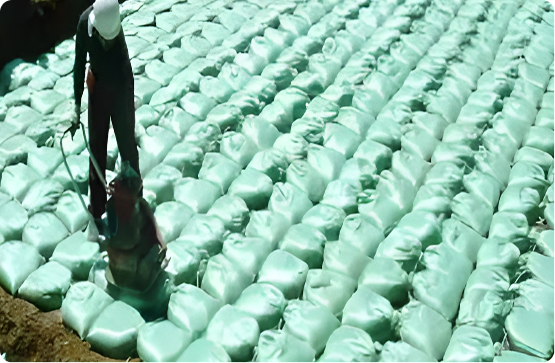 ZEROシステム工法は、リサイクルガラスカレットを中詰めした袋体(ハイカラパック)を地盤上に敷き並べる、環境配慮型の地盤補強工法です。 剛強な基礎の下に「柔らかな基礎」層を設けることで、建物の荷重を効果的に分散させ、不同沈下(建物の傾き)を抑制します。さらに、素材が持つ高い透水性により、地震時の液状化被害も軽減。土地の資産価値低下リスクを抑える、これからの時代に適した工法です。